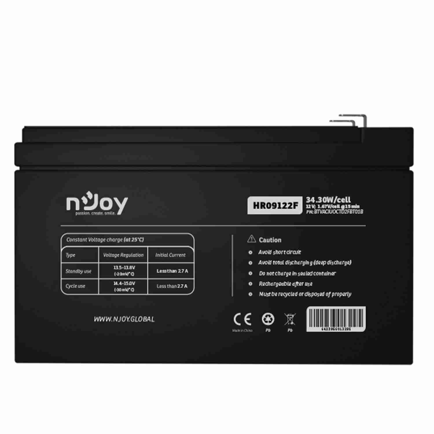 La batteria nJoy HR09122F è una batteria ricaricabile al piombo di tipo VRLA AGM (Valve Regulated Lead-Acid Absorbent Glass Mat).